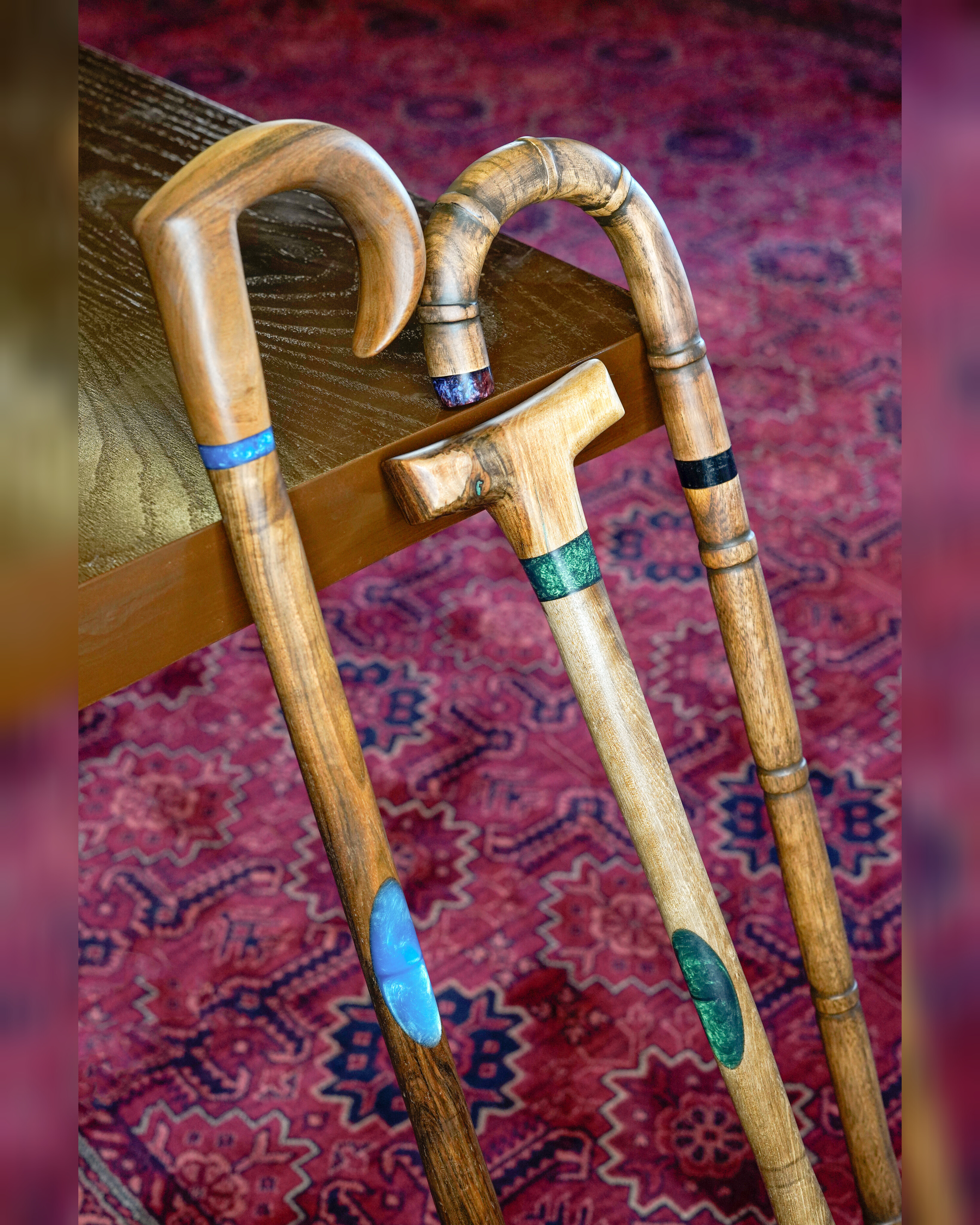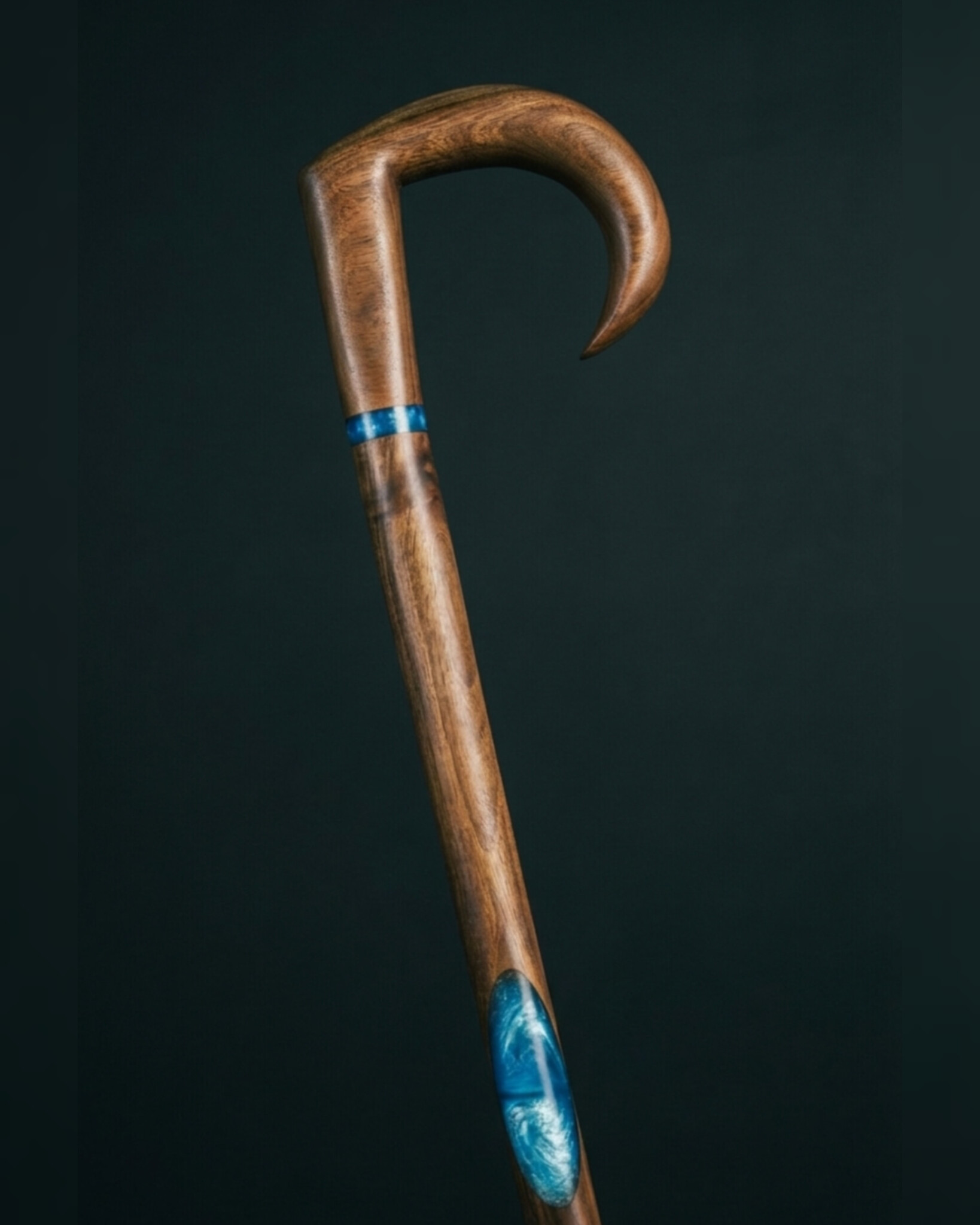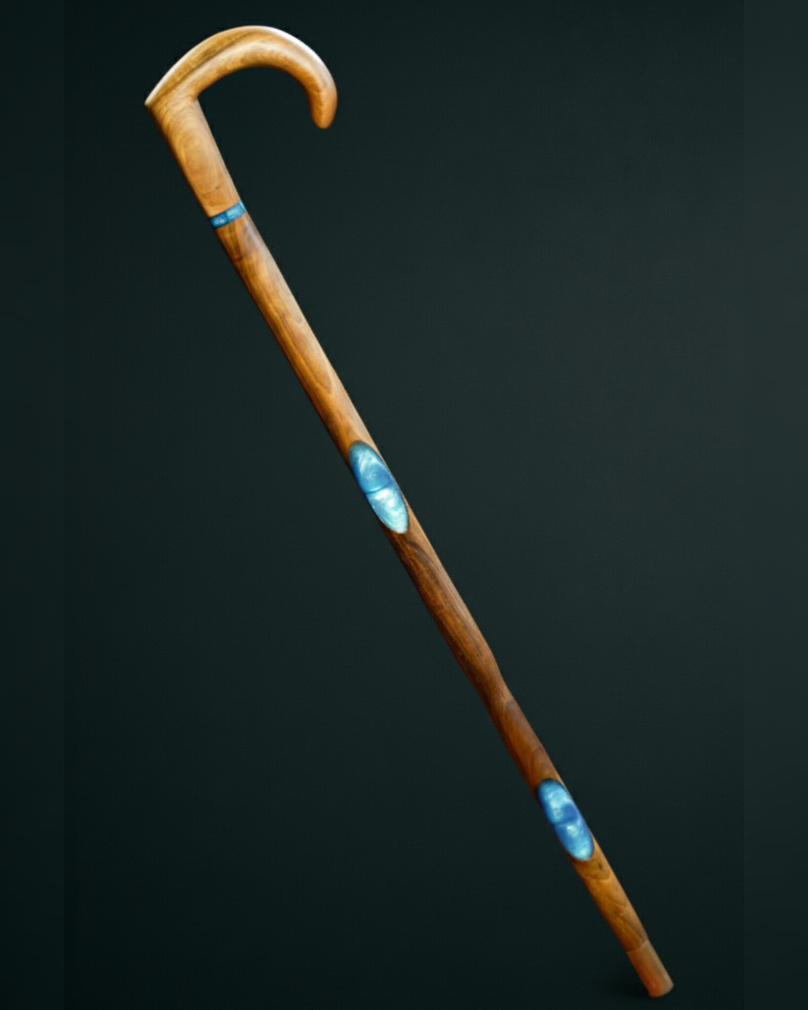 چوب گردو گیلان که در این عصا بهکار رفته، علاوه بر زیبایی بافت طبیعی، استحکام بالایی دارد. رزین آبی در حلقه و تزئینات بدنه نهتنها زیبایی بصری ایجاد کرده، بلکه بیانگر دقت بالا در فرآیند تولید است.